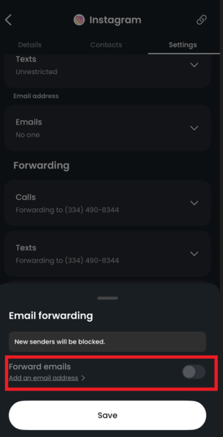 Forwarding settings can also be controlled for calls, emails, and texts individually. This allows you to control if you want communications to this identity through these channels to be stored only in the Cloaked app, or be forwarded directly to a personal e-mail or personal phone number.