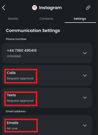 The communication settings allow you to control who can send communications to this identity by default. You can select Calls, Texts, or Emails to either have unrestricted access or to default block new contacts trying to reach you unless you specifically approve this contact.